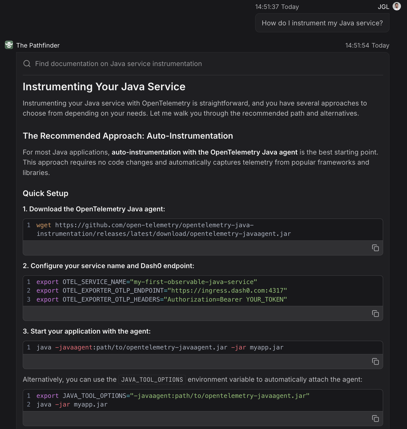 A developer asks Agent0 how to instrument a new Java service. The Pathfinder uses Dash0’s integrations and documentation to provide clear, step-by-step guidance — helping the team get telemetry flowing in minutes, not hours.