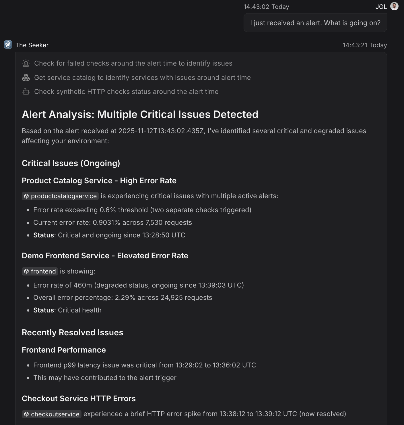 The Seeker acts as your on-call wingman — surfacing what others can’t see and guiding you through incident triage.