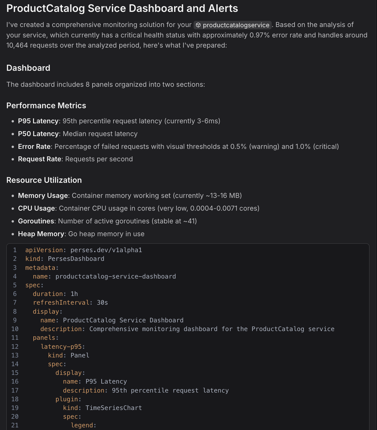 A developer asks Agent0 to “Create a dashboard and alerts for my ProductCatalog service.” The Artist analyzes existing telemetry, then generates a clean, best-practice dashboard with latency, error rate, and throughput — complete with alert rules that track SLO thresholds.