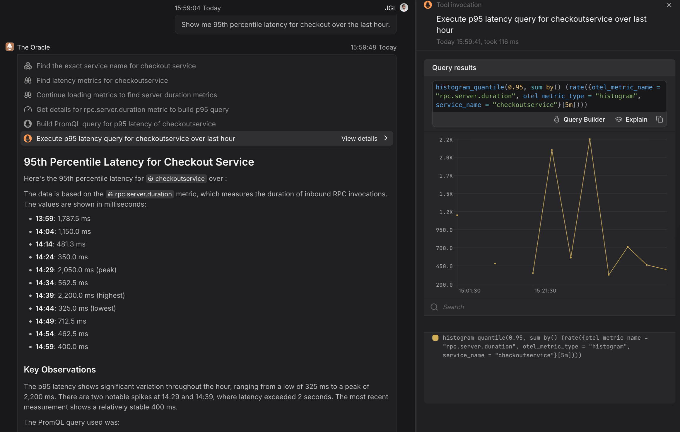 An engineer types: “Show me 95th percentile latency for checkout over the last hour.” The Oracle instantly generates the correct PromQL, explains what it does, and shows the resulting graph — no syntax errors, no guesswork.