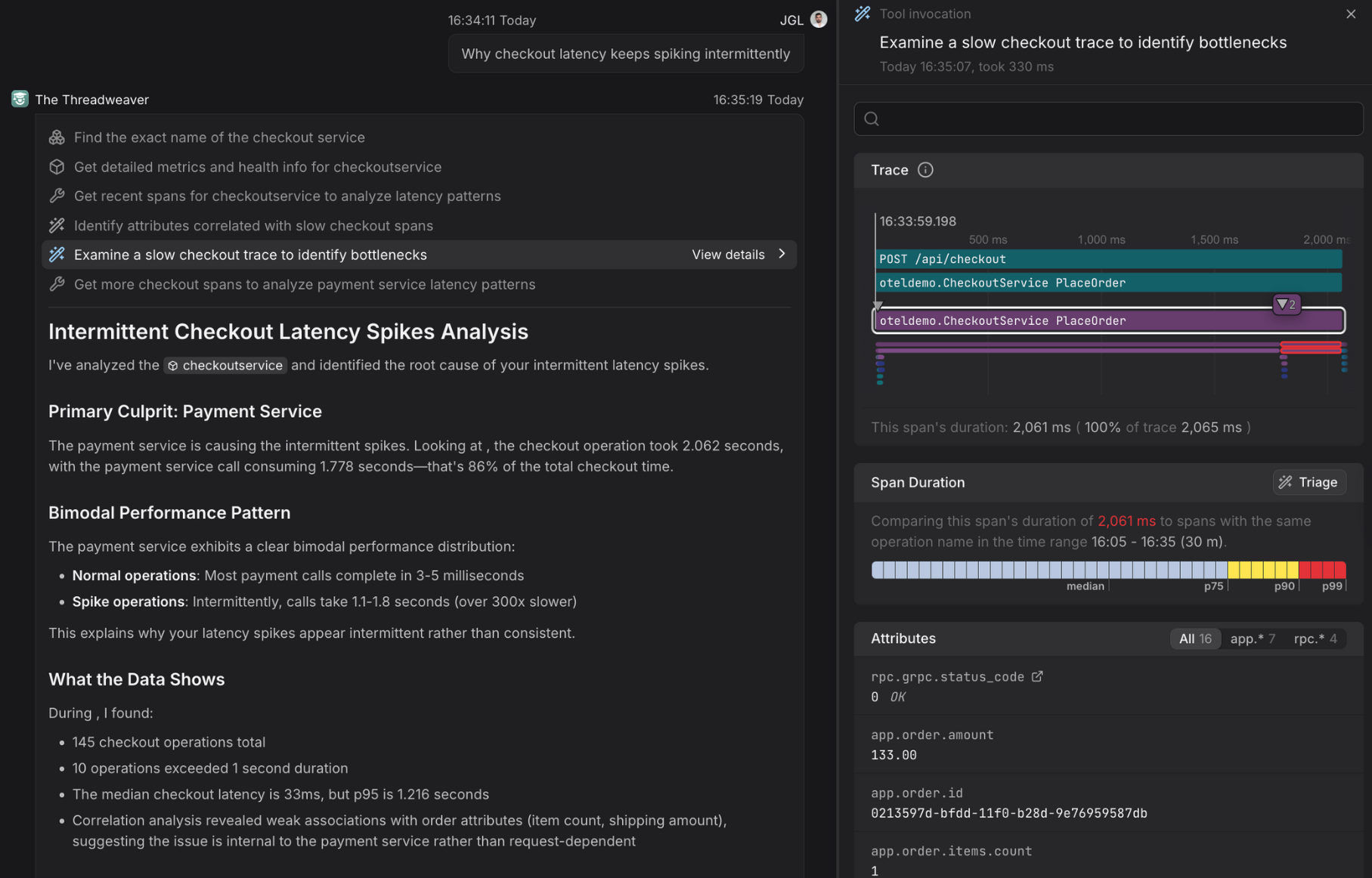 A developer wonders why checkout latency keeps spiking intermittently. They ask Agent0 to analyze recent traces. The Threadweaver stitches together the full journey across services, highlighting where the slowdown begins — a downstream dependency, introduced in the last deploy. Within seconds, the tangled web of spans becomes a clear story: what happened, where, and why.