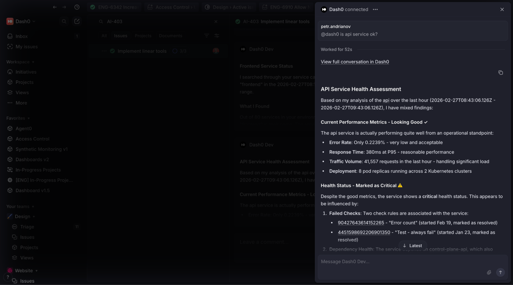 Once connected, mention @Dash0 in any Linear issue to start your first investigation.