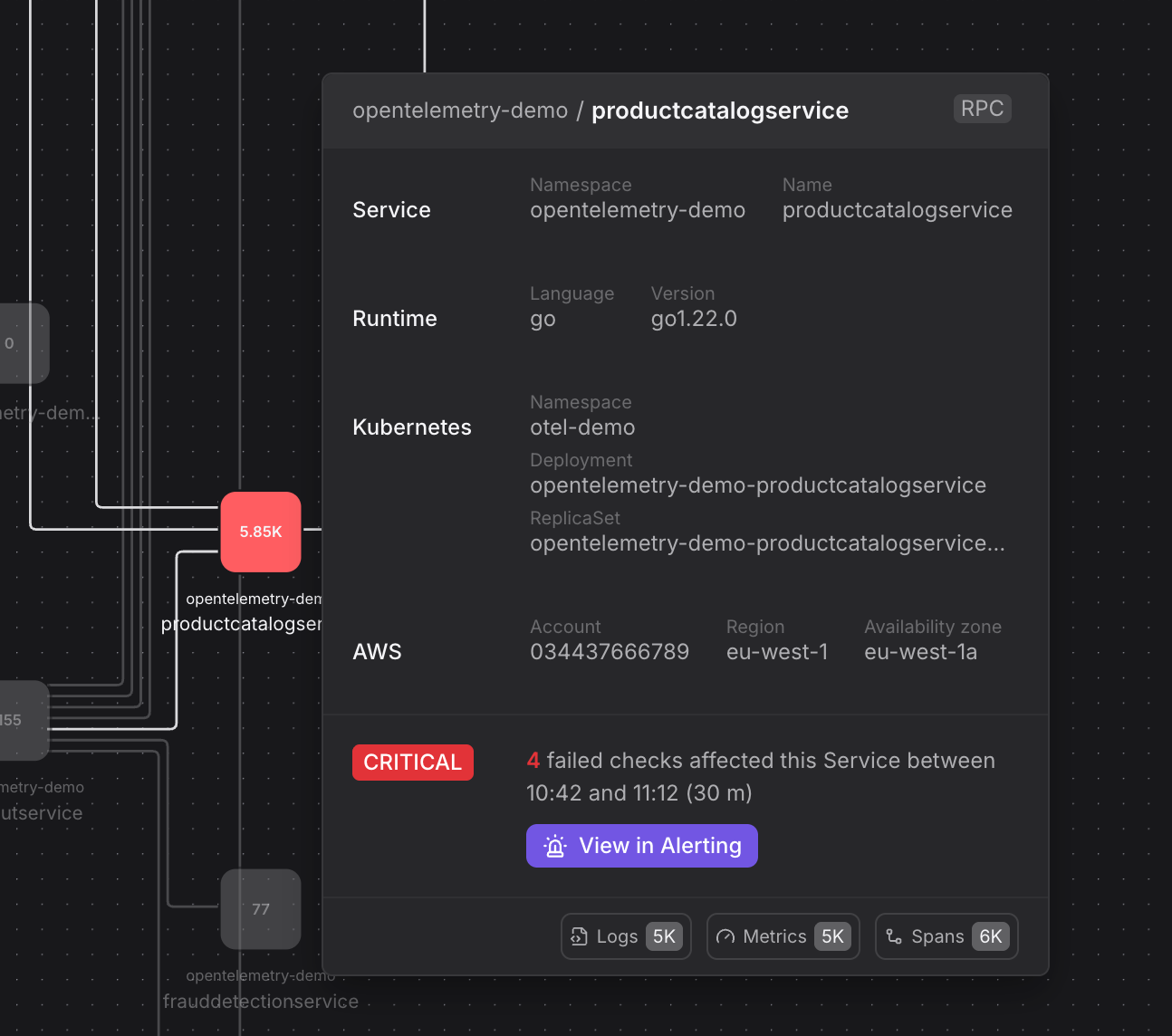 - Hover over any service to see how many logs, spans, and metrics it generated in the selected window, and jump into any of them with one click.