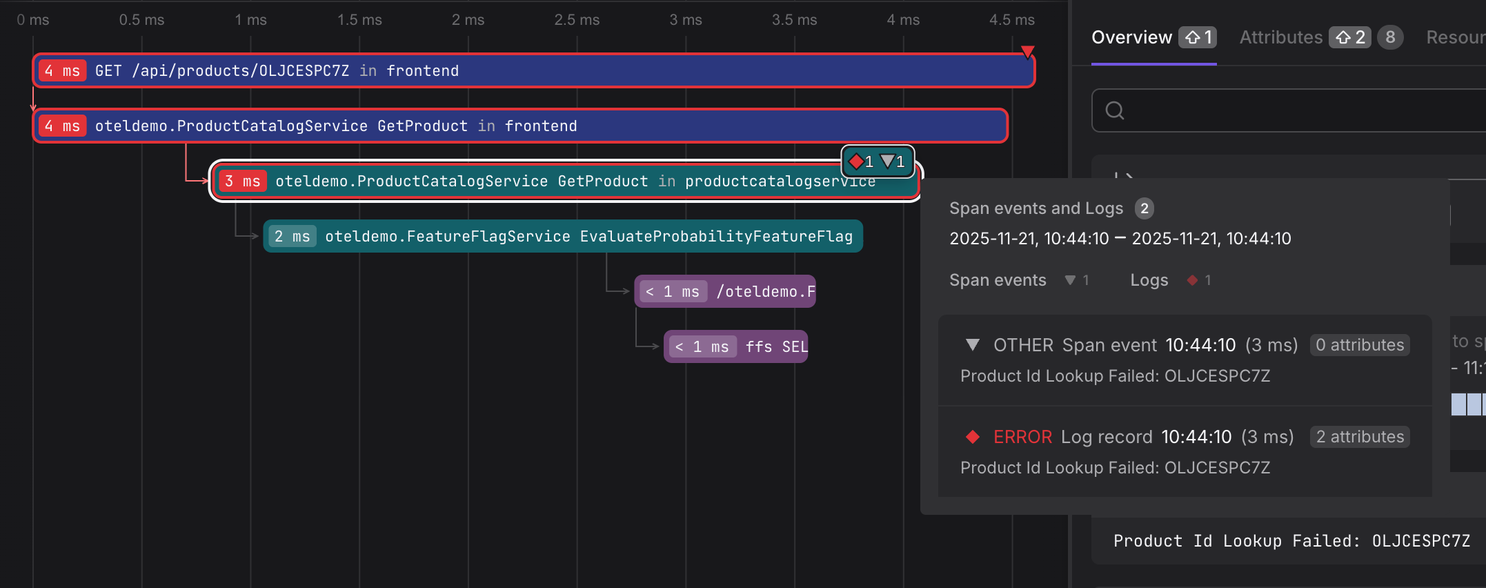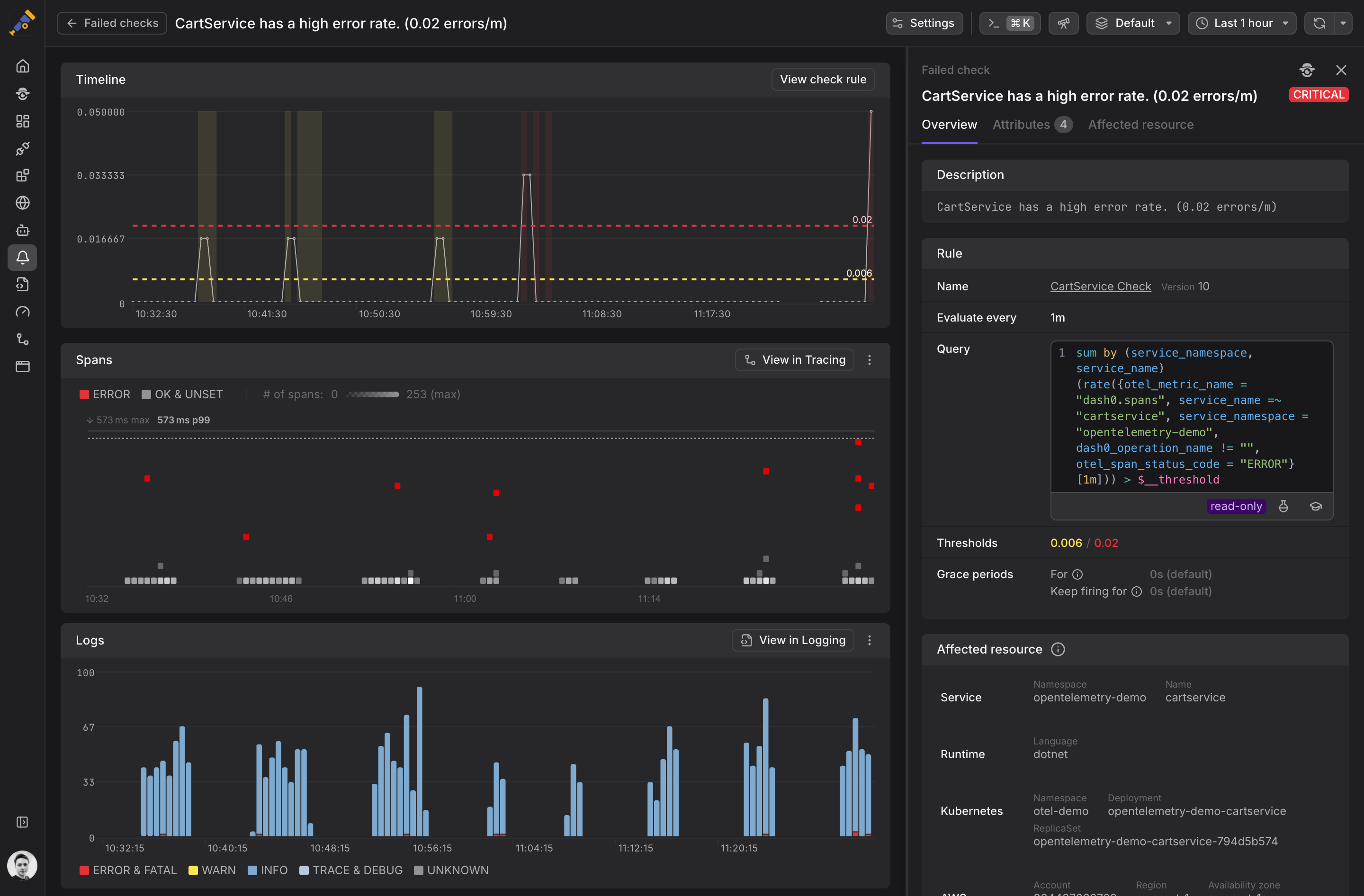 trace_idandspan_ididentifiers that connect events across resources. Dash0 reads the trace context from your telemetry and uses them as the backbone for linking logs, spans, and metrics that share the same request path. This means when you open a span in Dash0, you can instantly explore all related logs and metrics from that request even across microservices. It’s how we ensure that following a single trace feels like following a story, not jumping between data silos.