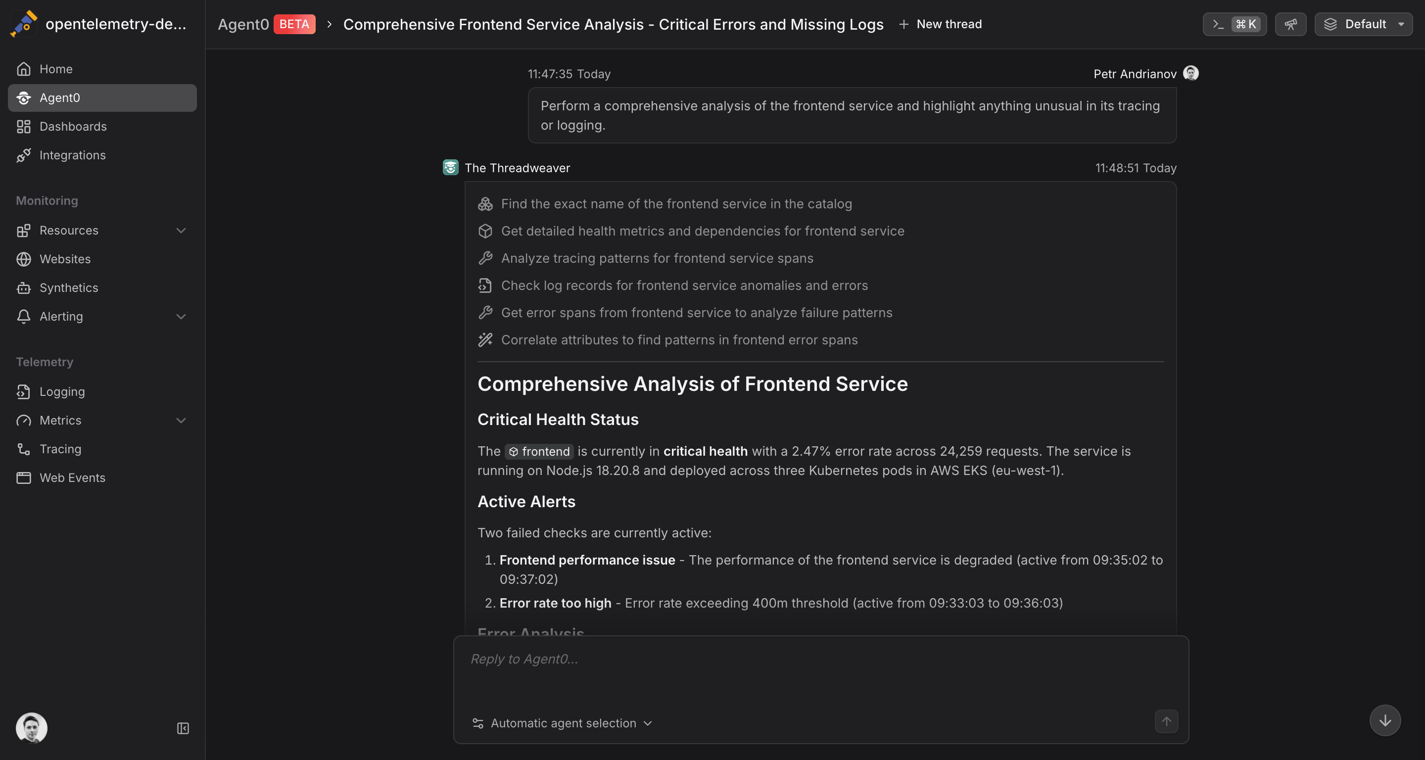 Agent0 scans across logs, traces, and metrics to uncover correlations automatically. Then it summarizes its findings in a concise, human-readable format.