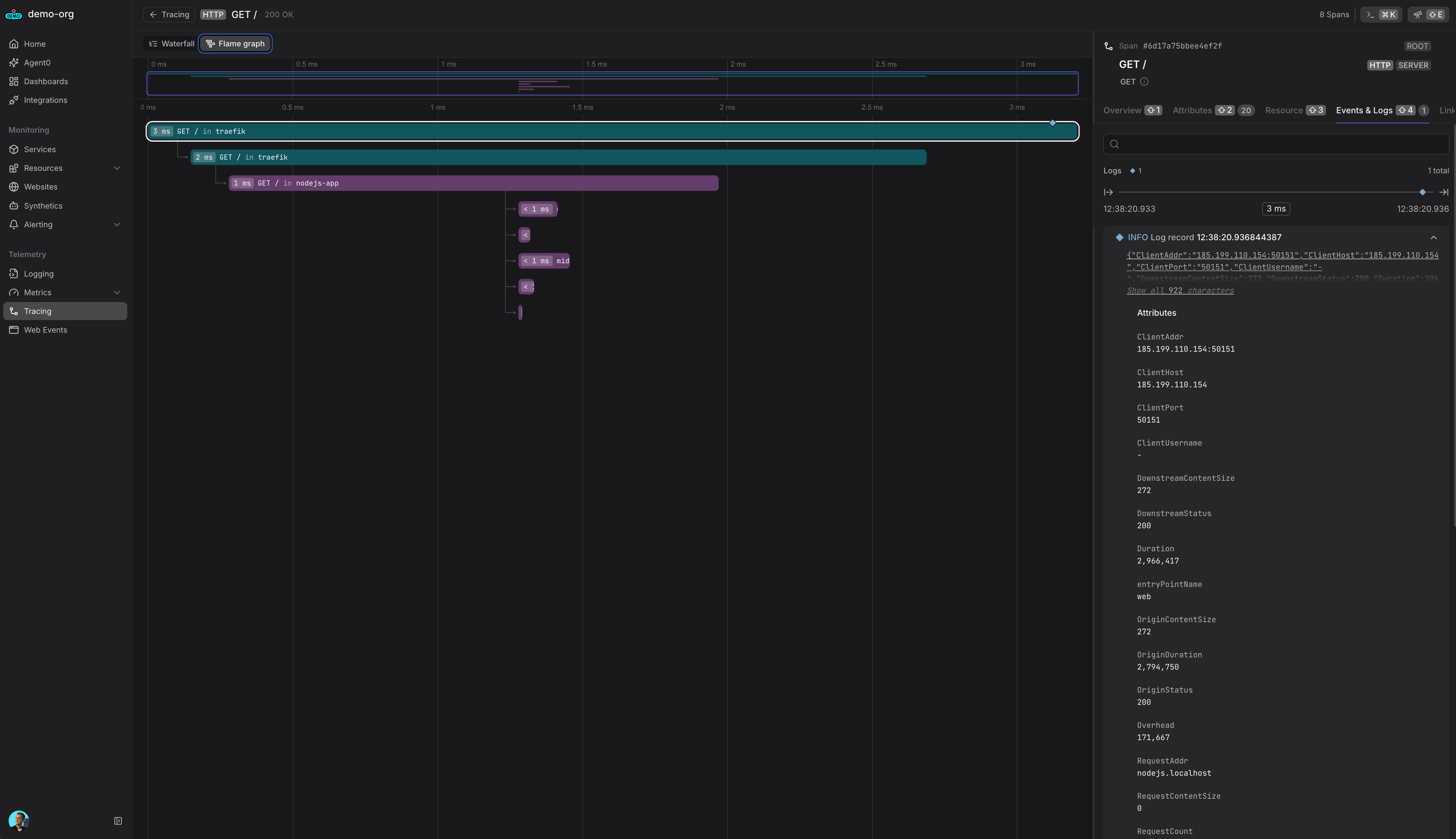 This setup instructs Traefik to generate spans for each request and send them over OTLP/HTTP to a Collector in the cluster. If a request arrives with a traceparent header, Traefik continues that trace. If not, it creates a new root span. Either way, you get ingress-level visibility. The spans carry attributes such as HTTP method, request path, status code, and client IP address, all aligned with OpenTelemetry’s semantic conventions.