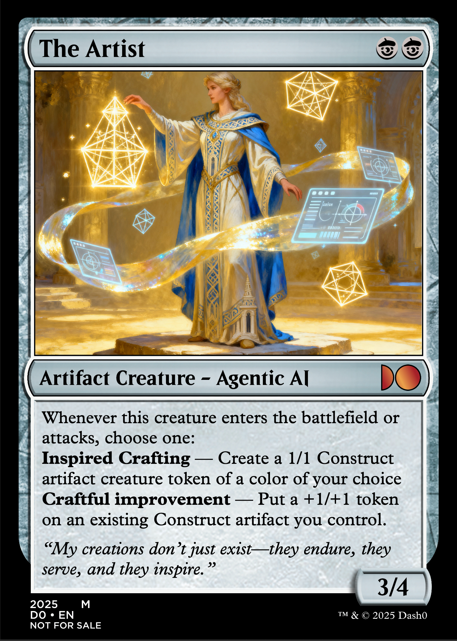 MtG has cards of different types, which are associated with different game mechanics: creatures, enchantments, instants, sorceries and so on. Given the fact we wanted to create cards about our Agentic AIs, the Artifact creature kind was an open-and-shut case.