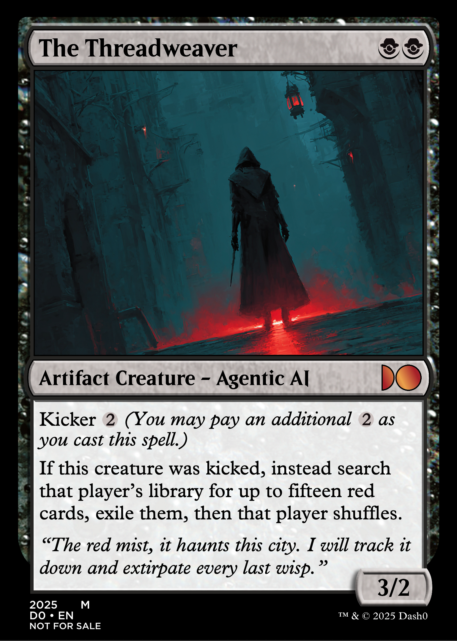 The Threadweaver is probably the card that required the most thought in terms of game rules. It is about analyzing traces to root out errors. Errors are red. And despite red being an allied color to black, I had this idea about a red mist spreading in the city bringing pain and suffering (like your errors in production tend to do), because errors in traces spread “backwards”, from server to client. We want errors to go away, and in MtG there are mechanics to exile cards from your opponent's library (i.e., their playing deck). Exiled cards cannot generally be played, and removing key cards from your opponents deck will disrupt their game plan. One card with this effect is the Sadistic Sacrament, which is expensive in terms of mana, and so it tends to be played too late in the game to have a strong effect. But if we make it playable early, it can wreck absolute havoc. So we took the exile mechanics, gave them to the Threadweaver, which like all Agentic AIs has low mana cost, and focused it on absolutely wrecking opponents relying on red cards.