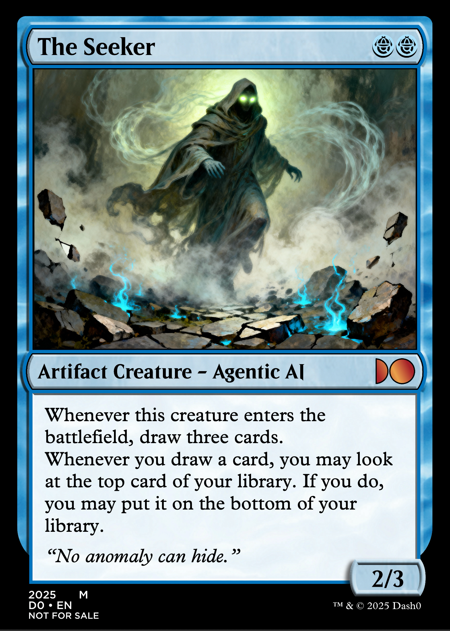 The high-fantasy idea of our Agentic AI characters fits MtG perfectly. And since I have spent significant amounts of time and (not so) disposable income as an adolescent and young adult collecting and playing Magic the Gathering, I think it took about 5 minutes from Mirko posting a Midjourney mock of the Seeker, to me creating a subscription on MTG Cardsmith and starting ideating the cards.