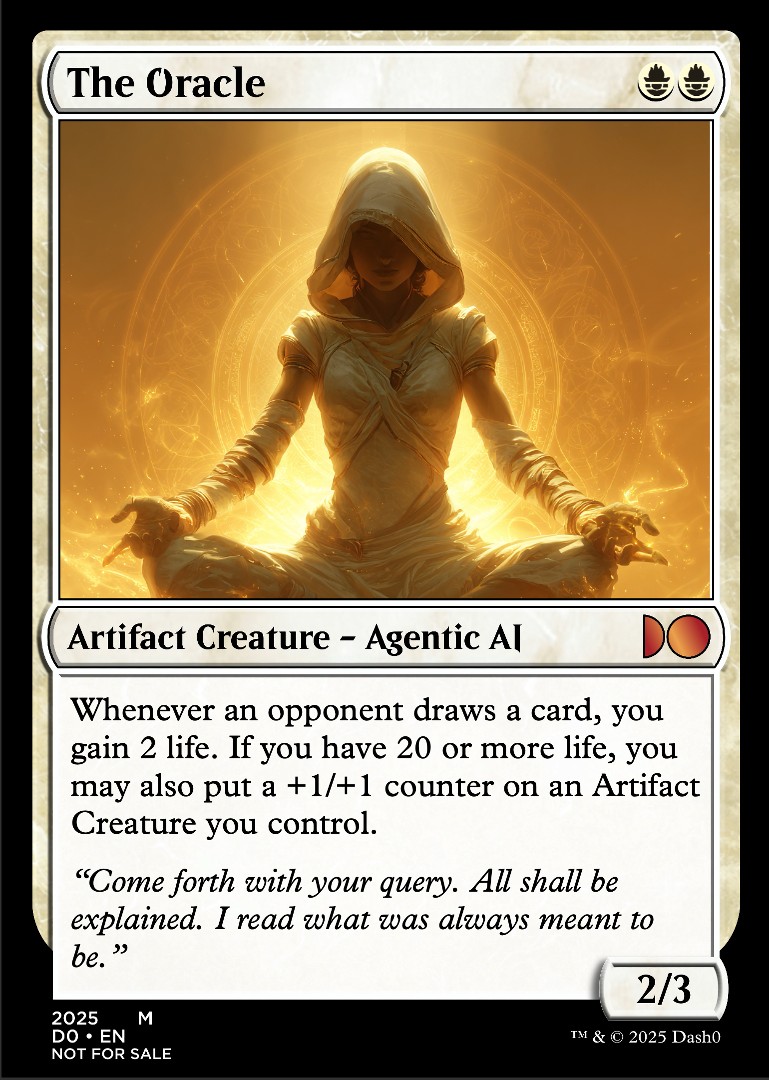 The low mana cost was easy to justify: Agent0 is always there for you, any time of day and night. In terms of MtG, it is like cards you can almost always play. We decided that each Agentic AI would cost two mana of their color.