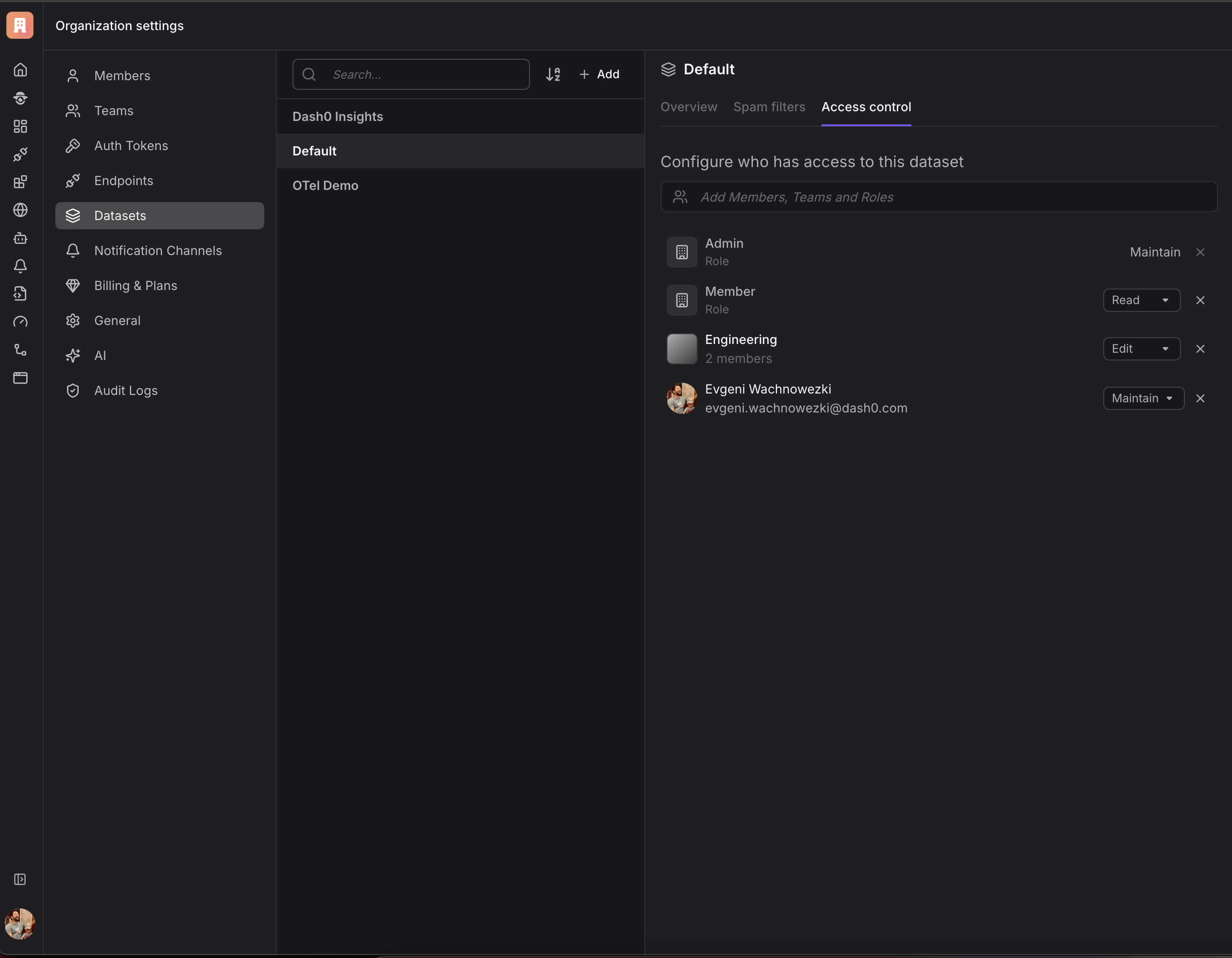 Every dataset now supports three roles: Viewer, Editor, and Maintainer. Viewers can explore all data and build non-intrusive assets like dashboards and views. Editors extend that by creating new check rules and synthetic checks. Maintainers hold the keys to telemetry-impacting settings - from spam filters to semantic convention versioning.