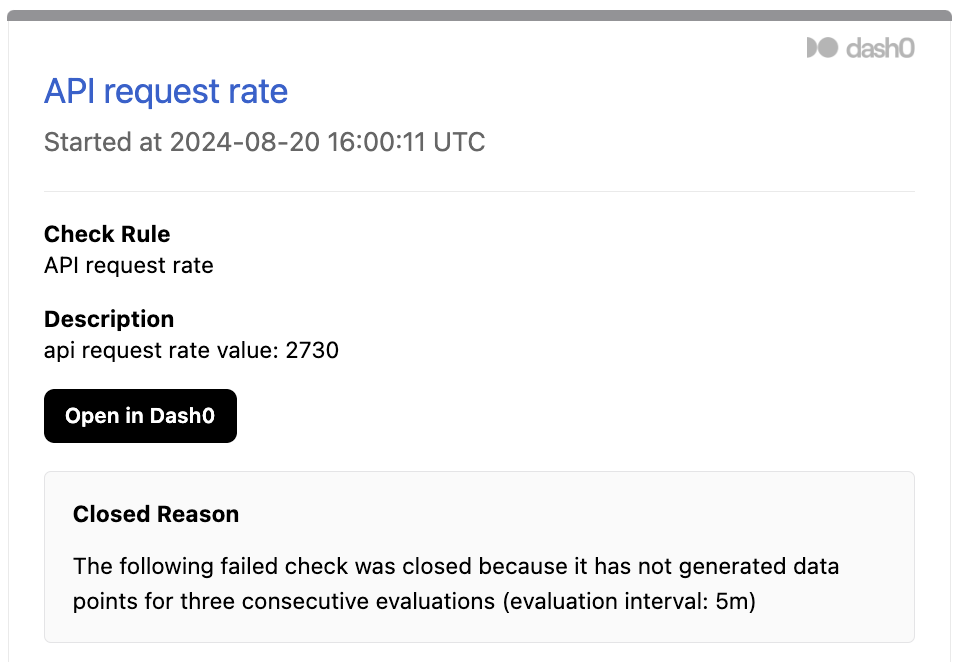 Our email notifications have been redesigned to include the same familiar affected resource breakdowns previously available only within the product. This update ensures you receive these insights directly in your inbox even before you open the failed check in Dash0.