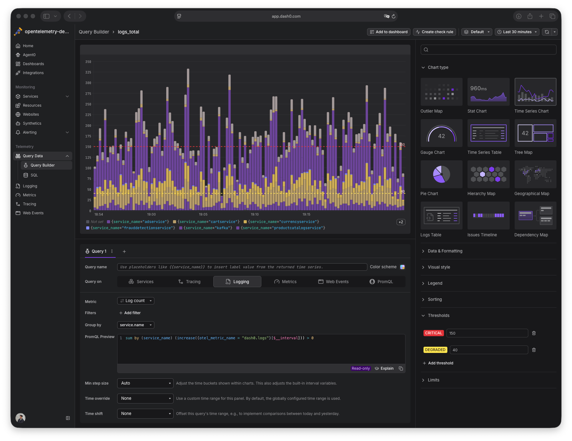 The Query Builder now uses the same interface as the dashboard panel editor. This means a more consistent experience across Dash0, and as we add new widget types to dashboards, they'll automatically be available in the Query Builder too.