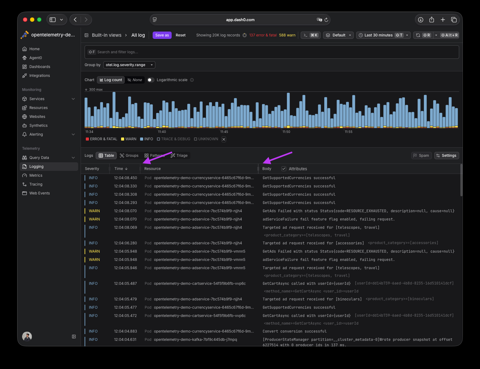 We've added drag-to-resize handles to table columns across Dash0's explorers. Hover over the table header row to reveal grip handles at column edges, then drag to adjust the width. Save your view to keep your preferred column sizes across sessions.