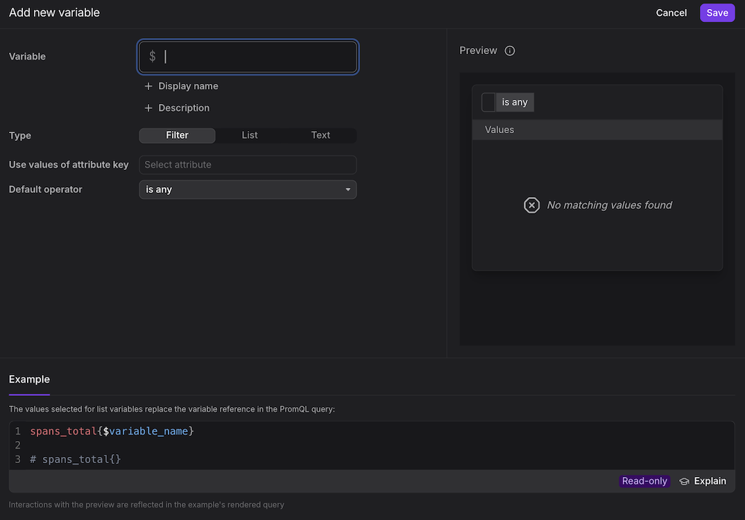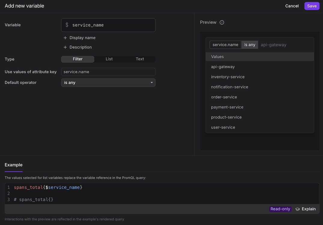 In Dash0, dashboarding variables can represent variables containing text that is defined once and can be reused in every panel.