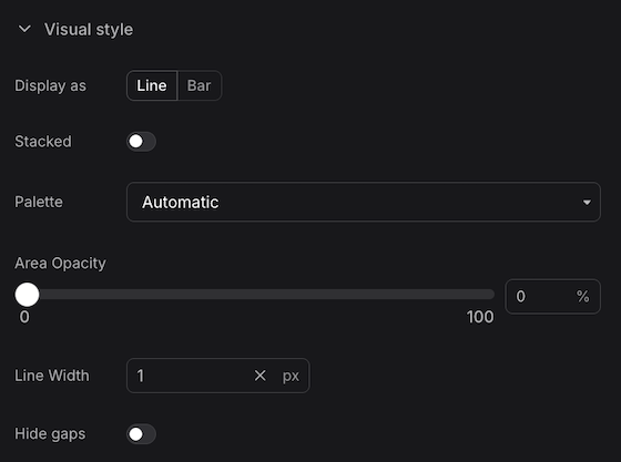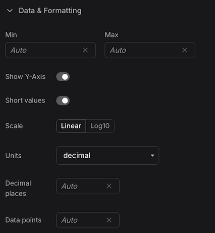 - Min/Max: This setting configures whether the chart's min/max values are dynamically determined based on the seen data or set to fixed numbers. Fixed numbers can be handy for charts visualizing percentages or when there is a genuinely known minimum/maximum. You can also choose to hide the min/max value presentation entirely from the min/max lines.
