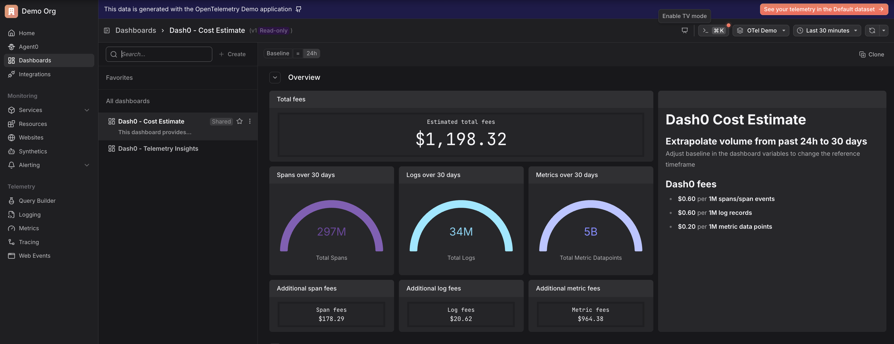 Last updated: March 3, 2026Cost ControlControl over the cost of your observability is essential. You want to turn your observability data into valuable insights that help you, at the right price point. Dash0 gives you clear visibility into your costs.