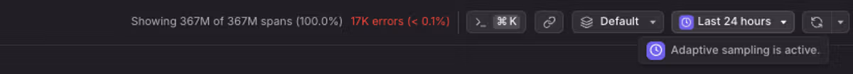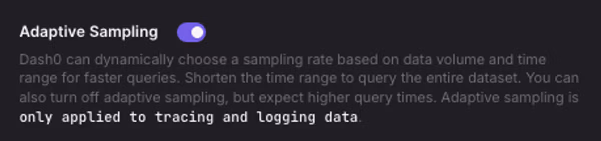 Adaptive Sampling ensures Dash0 queries remain fast when exploring large volumes of logs, traces, and metrics. When you query data in the Dash0 UI, sampling is automatically applied when needed to maintain responsive performance.