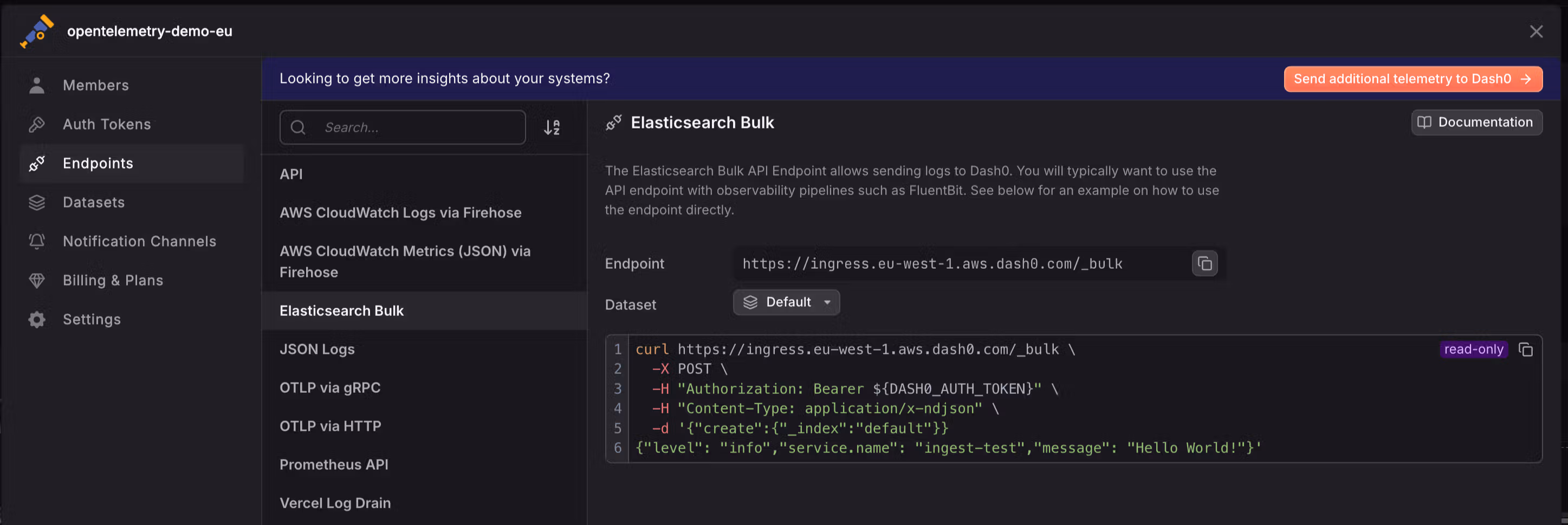 Endpoints in Dash0 are the public-facing APIs that allow you to send and retrieve telemetry data from your systems. Each endpoint is designed to work with specific data types and sources, giving you flexibility in how you integrate Dash0 with your existing infrastructure.
