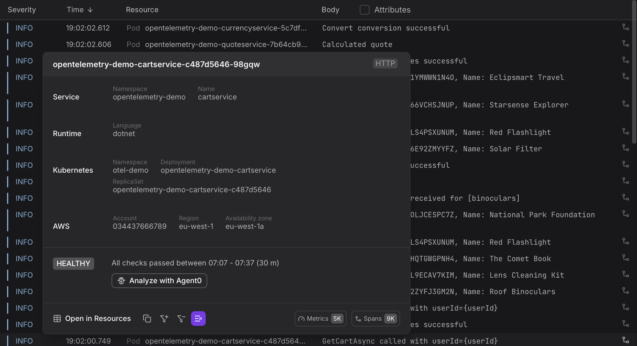 | Resource | Where the log record came from — for example which Kubernetes pod and what service is associated with it. Helps distinguish logs from different services or deployments at a glance. |