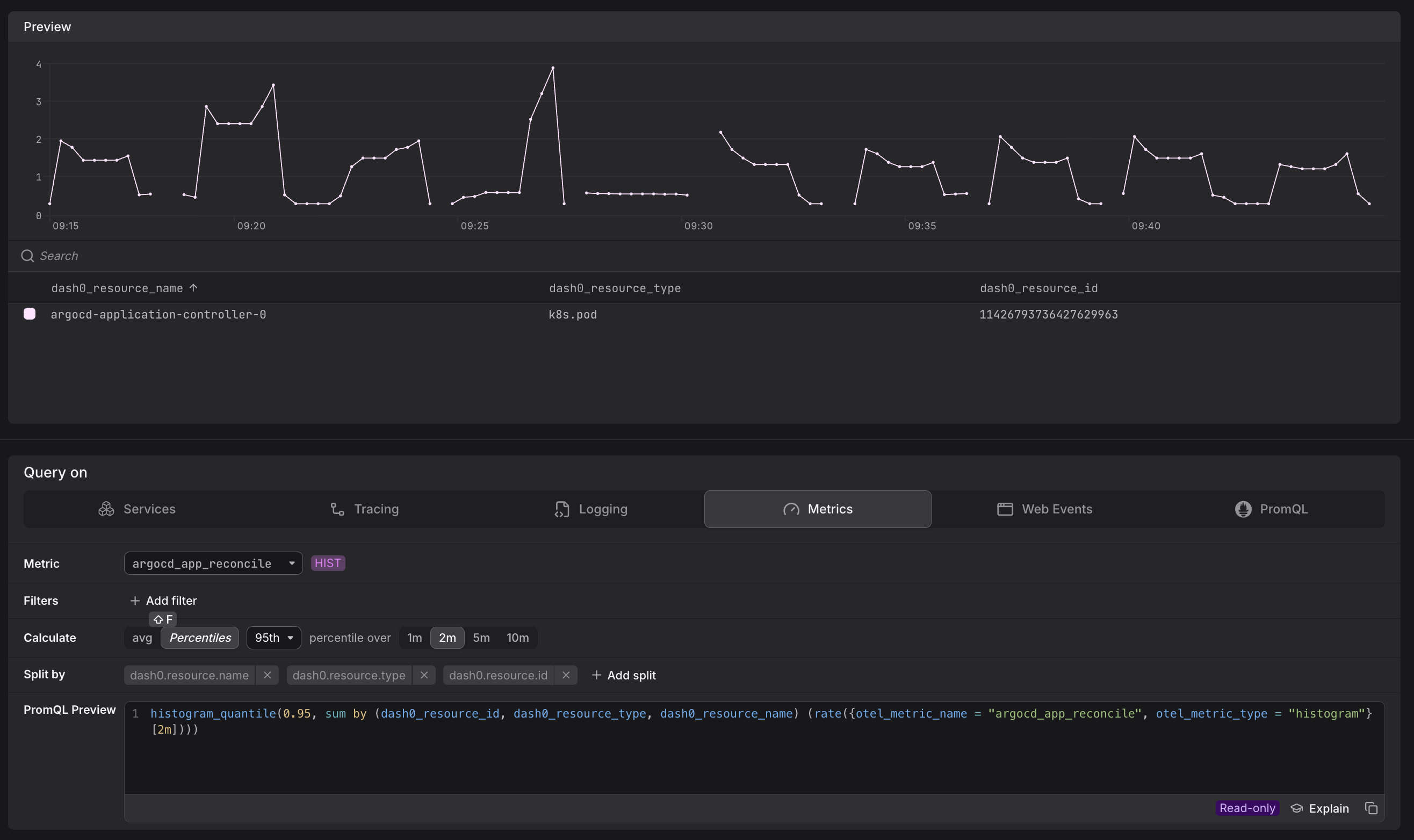 Selecting a metric without any label filters can return thousands of time series. Add otel_metric_name, otel_metric_type, or resource-level filters to constrain the result set before aggregating. See Optimize PromQL Query Performance for a full guide.