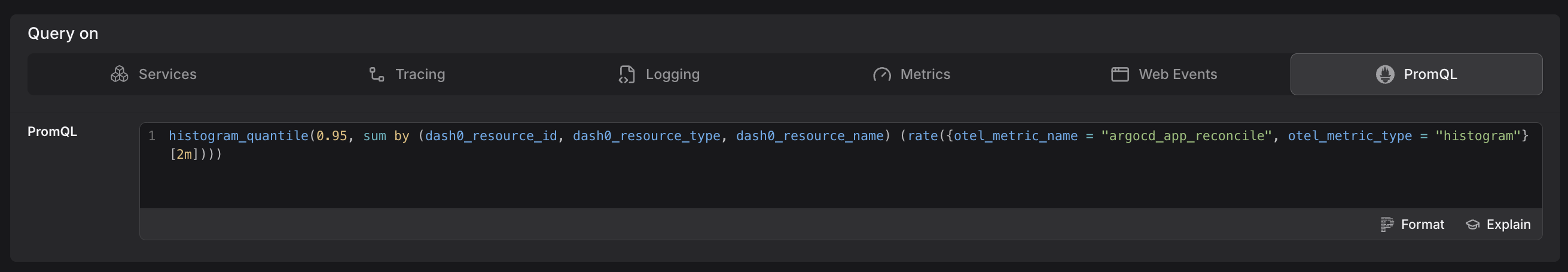 The other tabs (Services, Tracing, Logging, Web Events) expose pre-defined query scenarios tailored to each signal type — for example, request rates and error rates for services, or log-pattern counts for logs. These are backed by synthetic metrics and use the same visual interface.