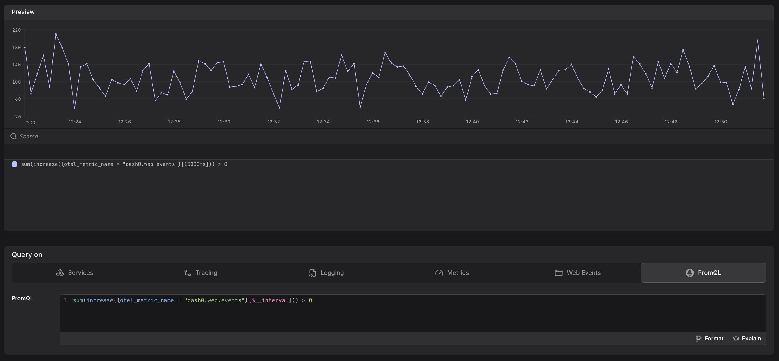 The $__interval placeholder is automatically replaced by Dash0 based on the selected time range, keeping step sizes appropriate.