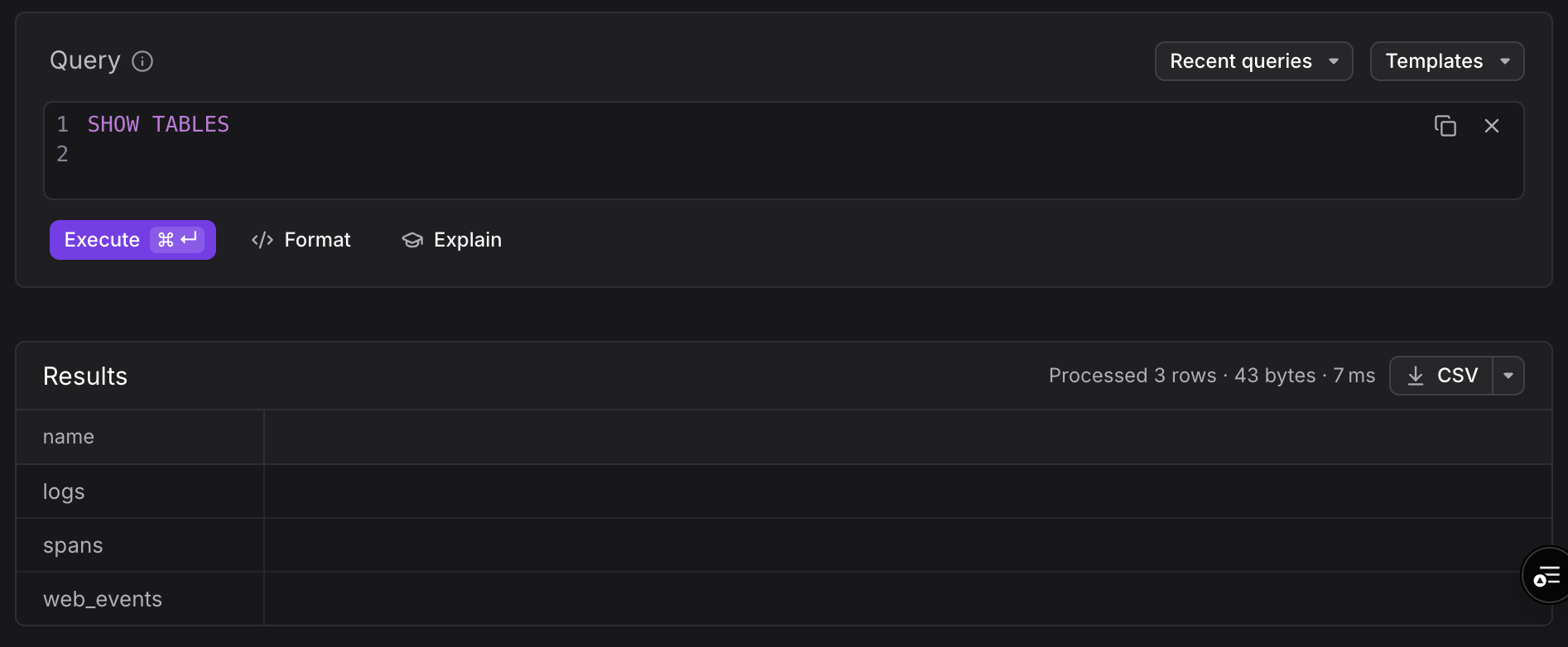Returns all queryable tables in your Dash0 environment, such as logs, spans, and web_events.