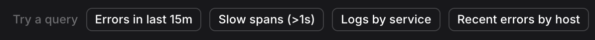 When the editor is empty, a set of suggested queries appears below it, such as Errors in last 15m, Slow spans (>1s), Logs by service, and Recent errors by host.