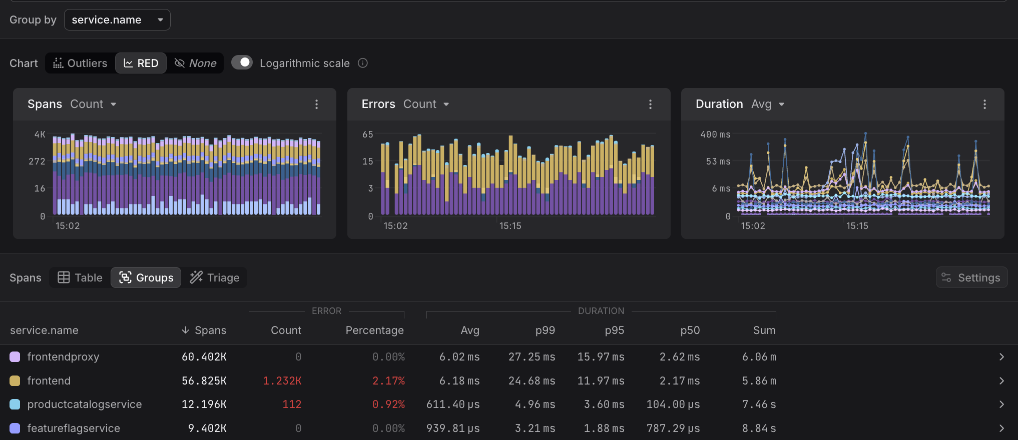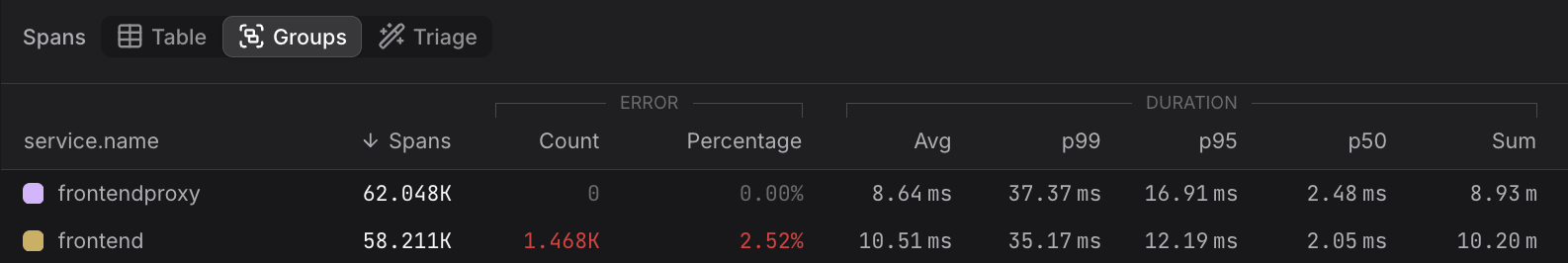 - Spans — total number of spans in the group within the selected time range; the default sort column