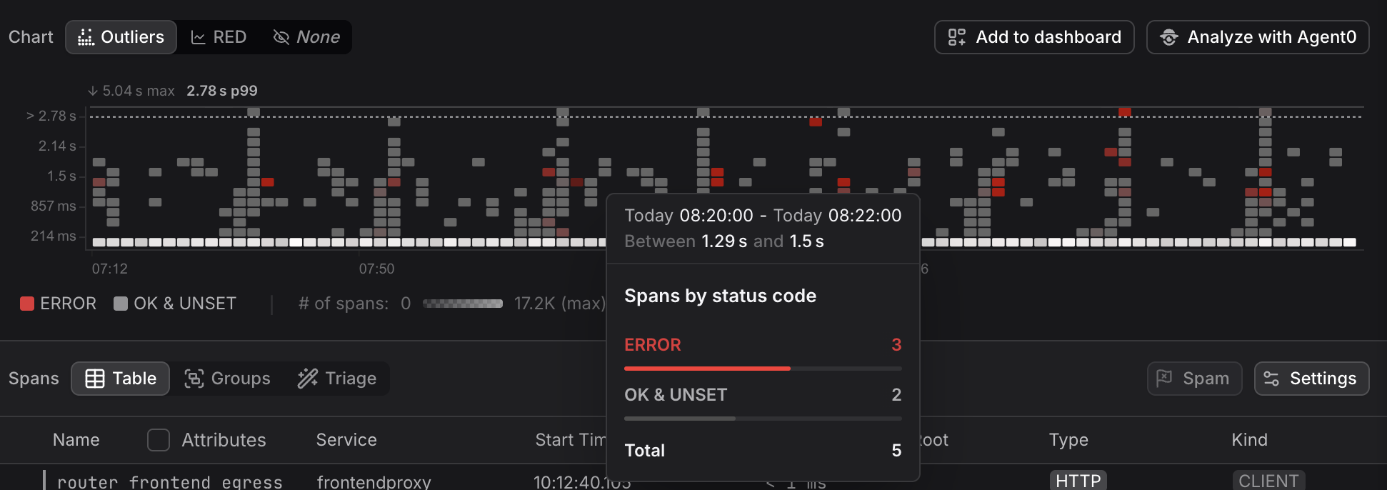 - Redness: percentage of spans in the bucket with span status code