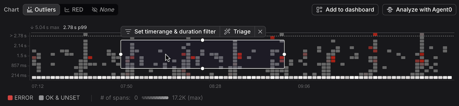- Filters the Span Table below it to show only spans within the selected region, which you can finetune by clicking Set time range & duration filter right above the selection.