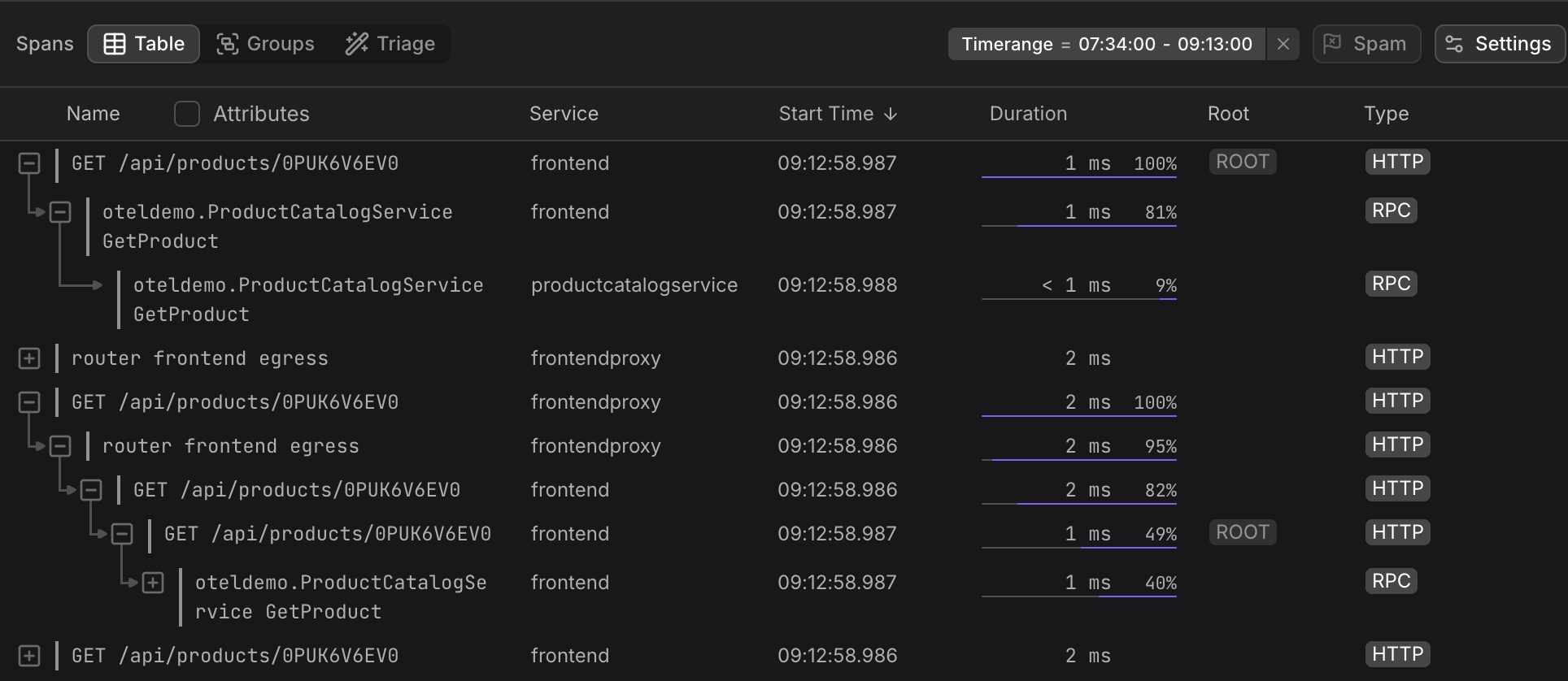 The Span Table groups by service, not by resource. This differs from the Log Explorer, which uses resources as its reference point.