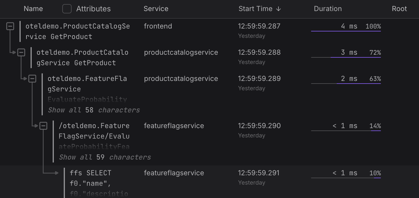 When you apply a filter, the table shows spans that match the criteria. Descendant spans appear beneath each matching span regardless of whether they themselves match — so you always see the full structural context of a matching span without losing the tree structure.