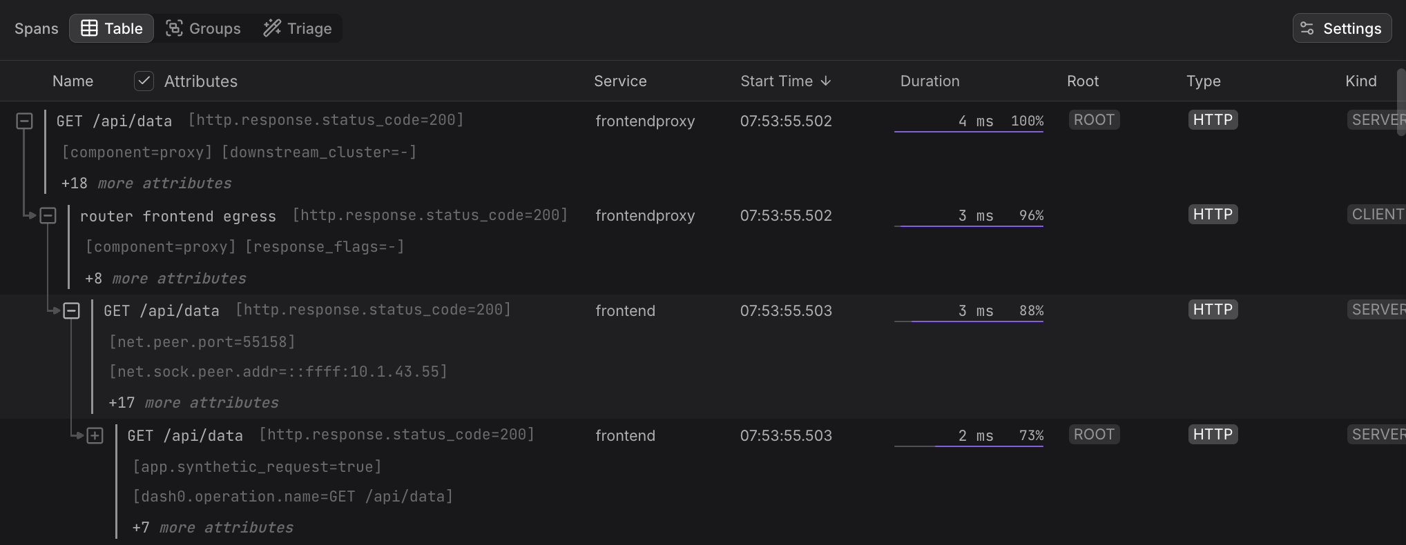 Click the Attributes checkbox to see more finegrained information directly in the Span Table.