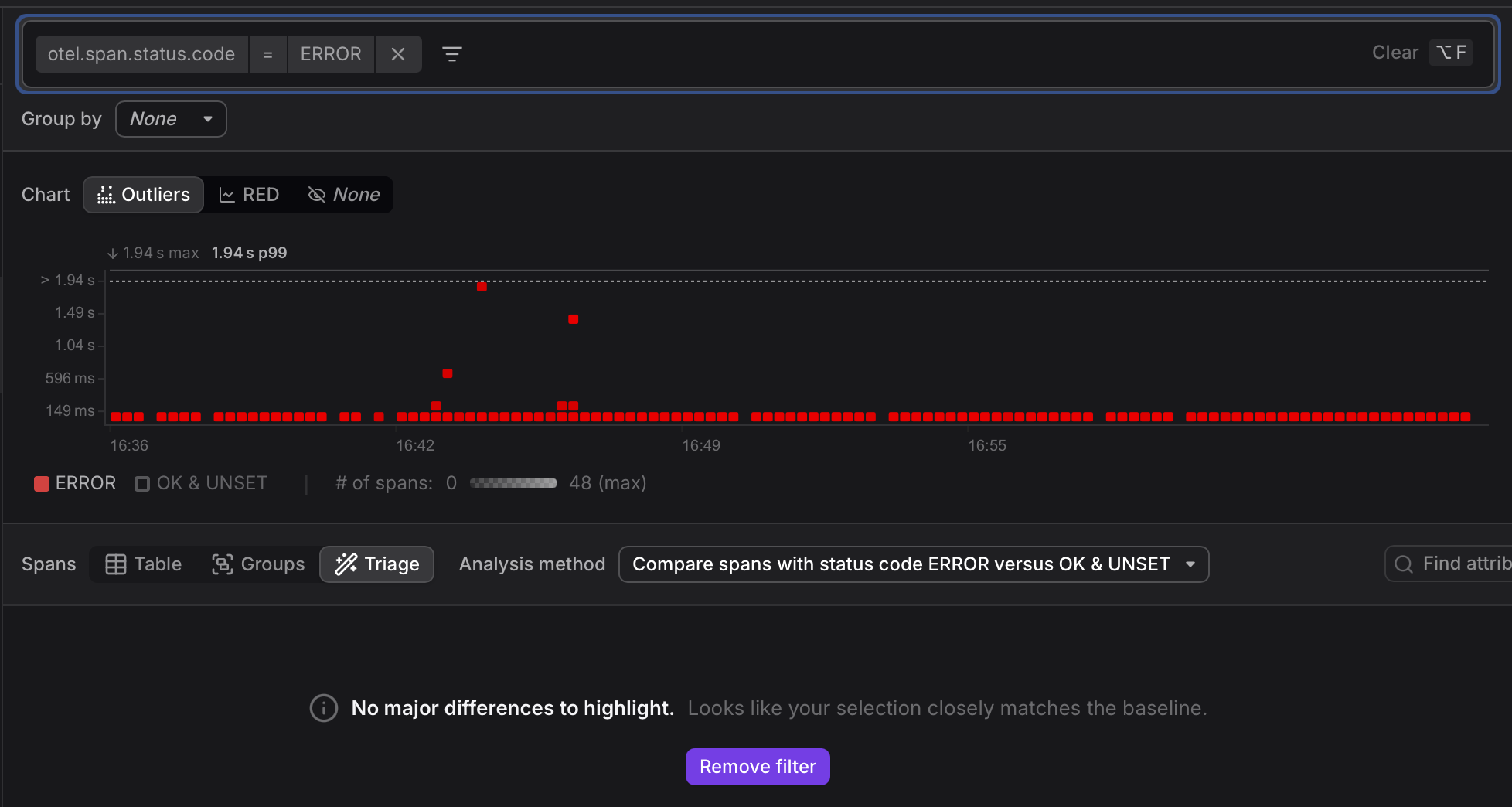 Clicking Remove filter removes the status code filter, restoring a baseline population so that Triage can perform its comparison. The error spans remain the analysis group; the non-error spans become the control group.
