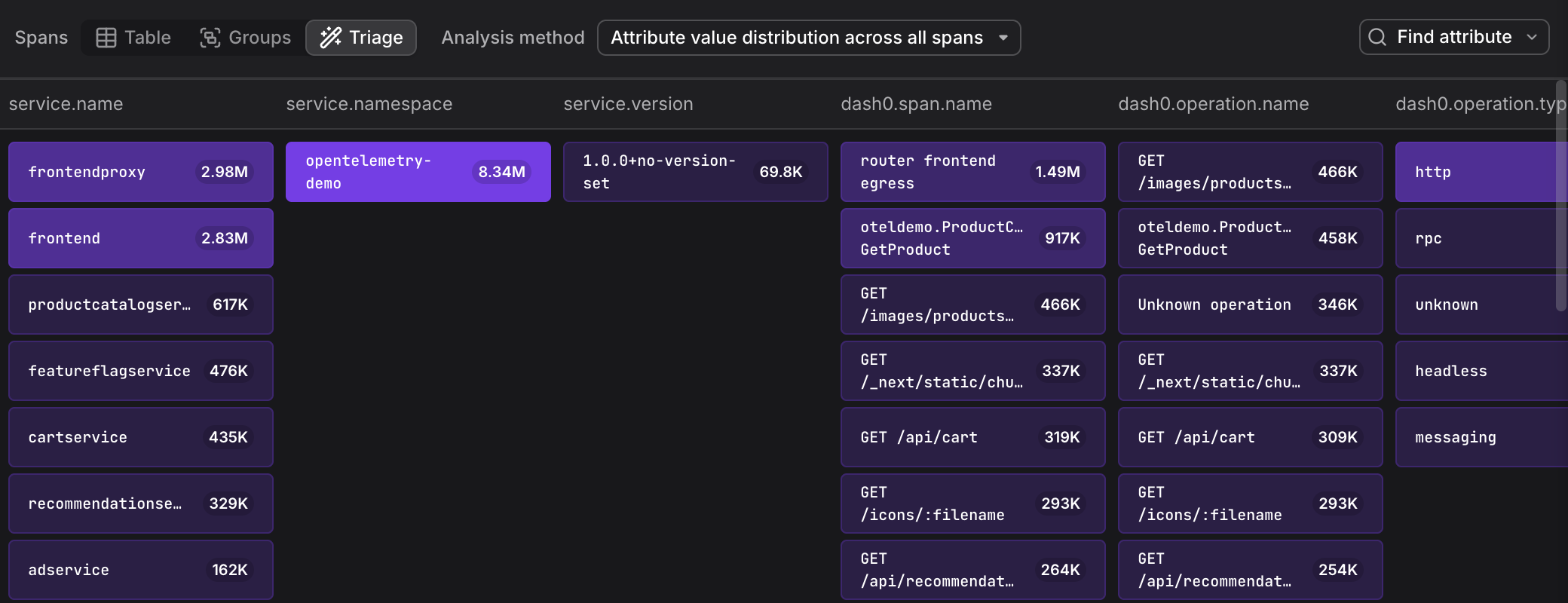 Triage performs automated comparative analysis to surface attributes that differentiate erroneous or slow spans from a baseline.