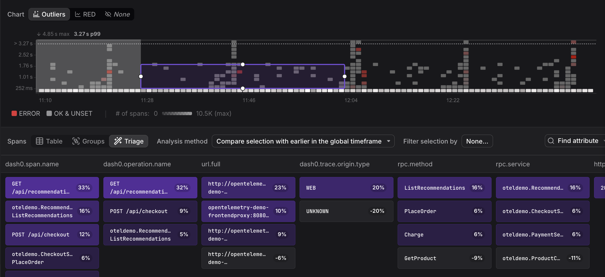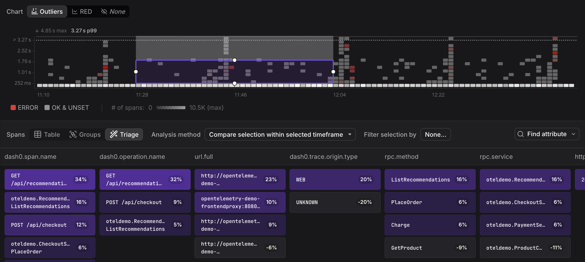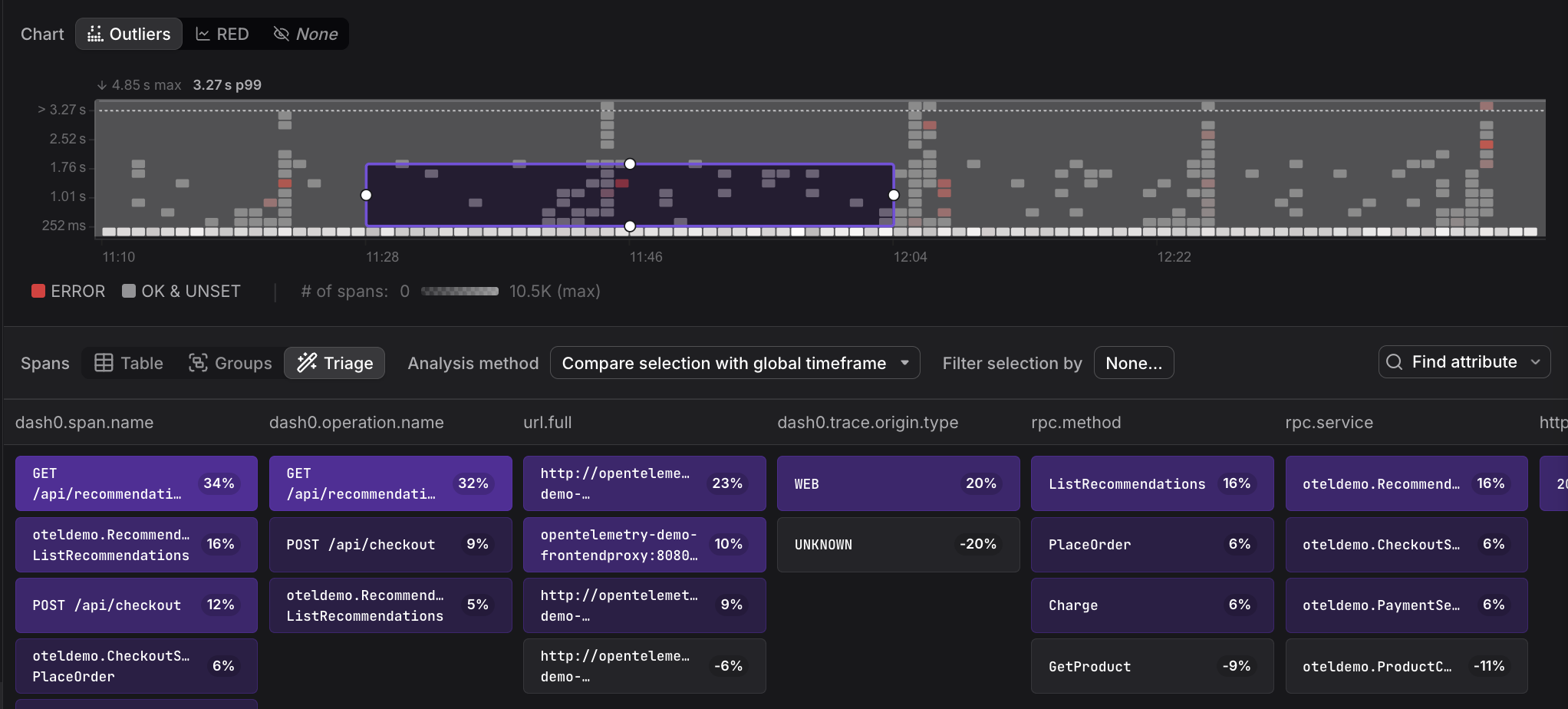 TipUse this to find what makes a region stand out from typical activity. For example: select a cluster of red spans in the Outliers Map and compare against the baseline to find which attributes — such as a specific customer ID, endpoint, or database instance — are concentrated in the failing spans. It also works well for latency: select high-duration spans and compare them against the rest to surface common factors like a slow downstream service or an unusual query pattern.