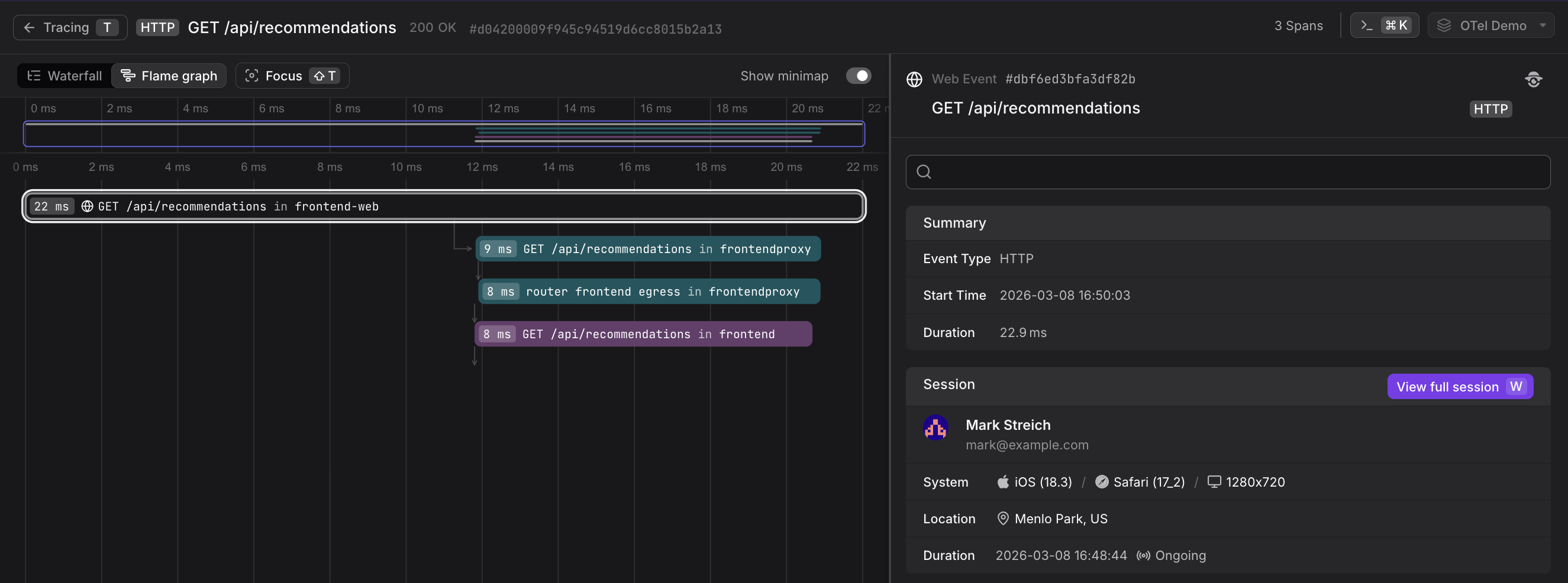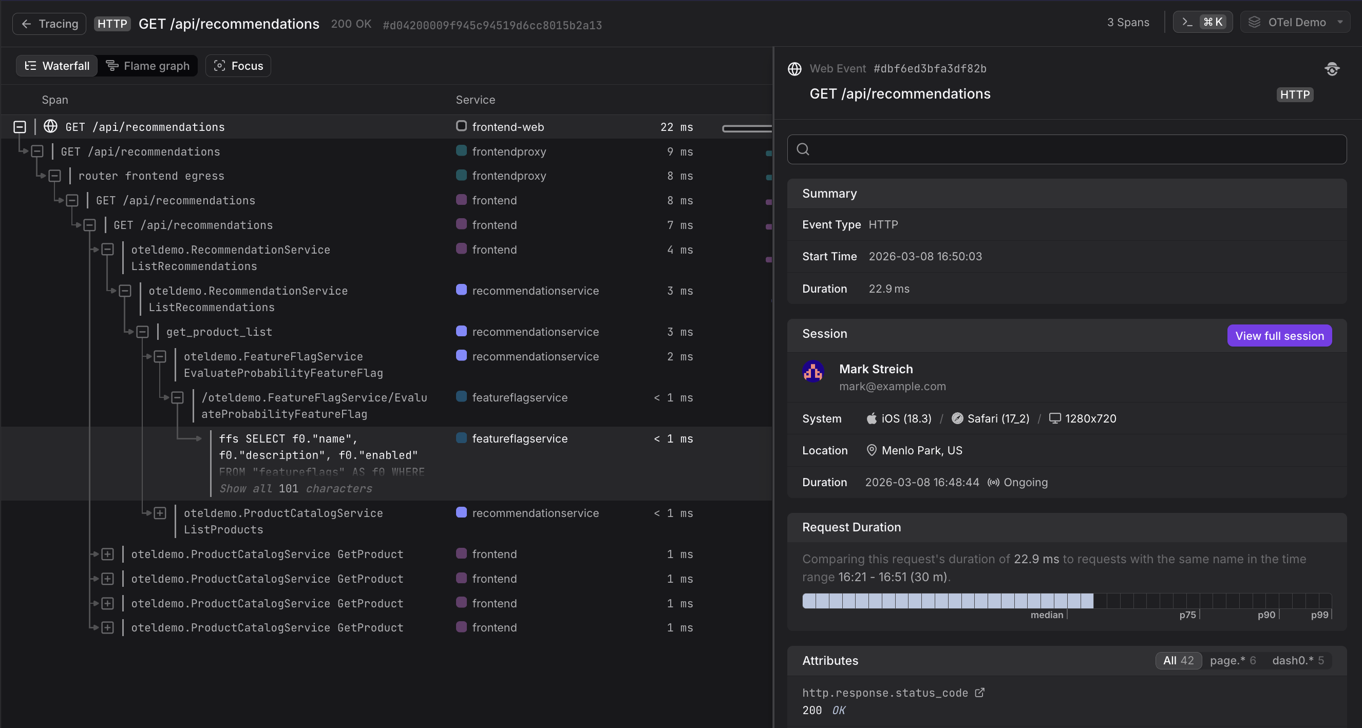 The top of the trace may include a Web Event entry — a span originating from web monitoring that triggered the trace. When selected, this entry shows a Session panel in the sidebar with the user's name, email, system details (OS, browser, screen resolution), and location. A View full session button links to the full web monitoring session. A Request Duration chart is also shown, comparing the duration of this specific request against requests with the same name over the selected time range.