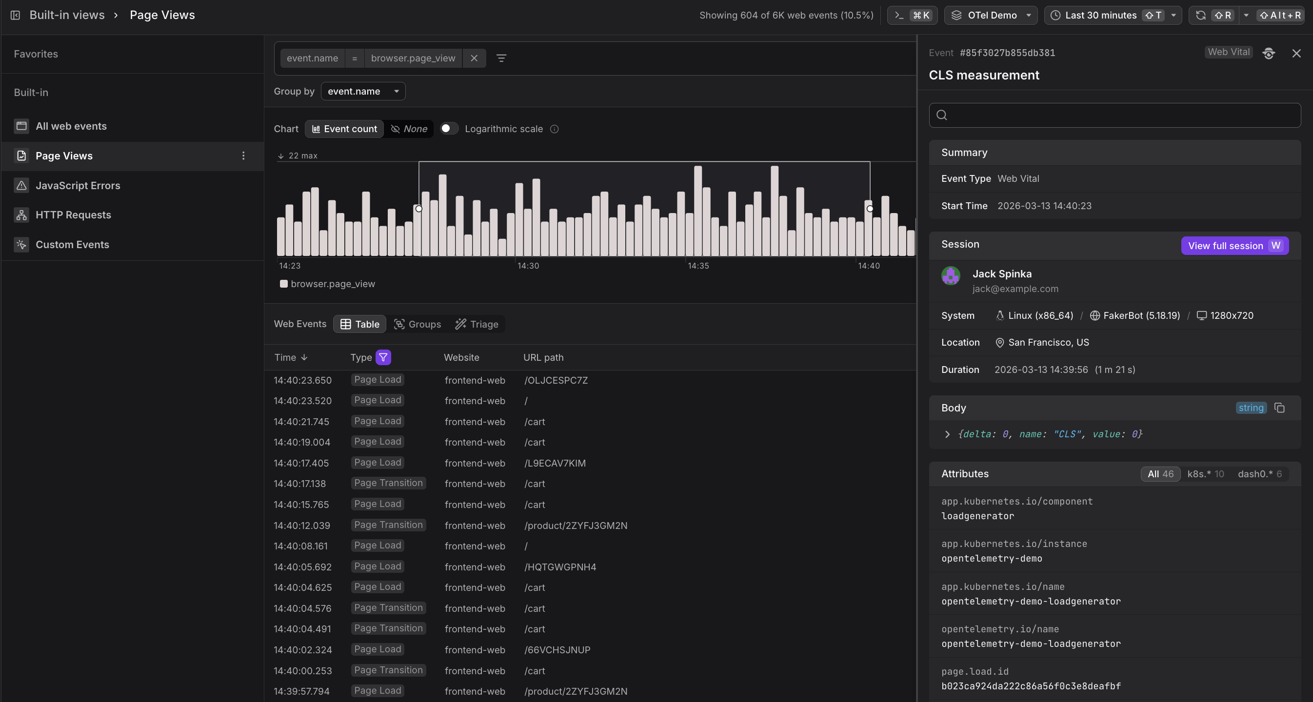 The Page Views built-in view filters the event stream to browser.page_view events only. Use it to understand how users navigate your website — which pages are visited most, how often users arrive via a full page load versus a single-page transition, and where in a session a navigation occurred.