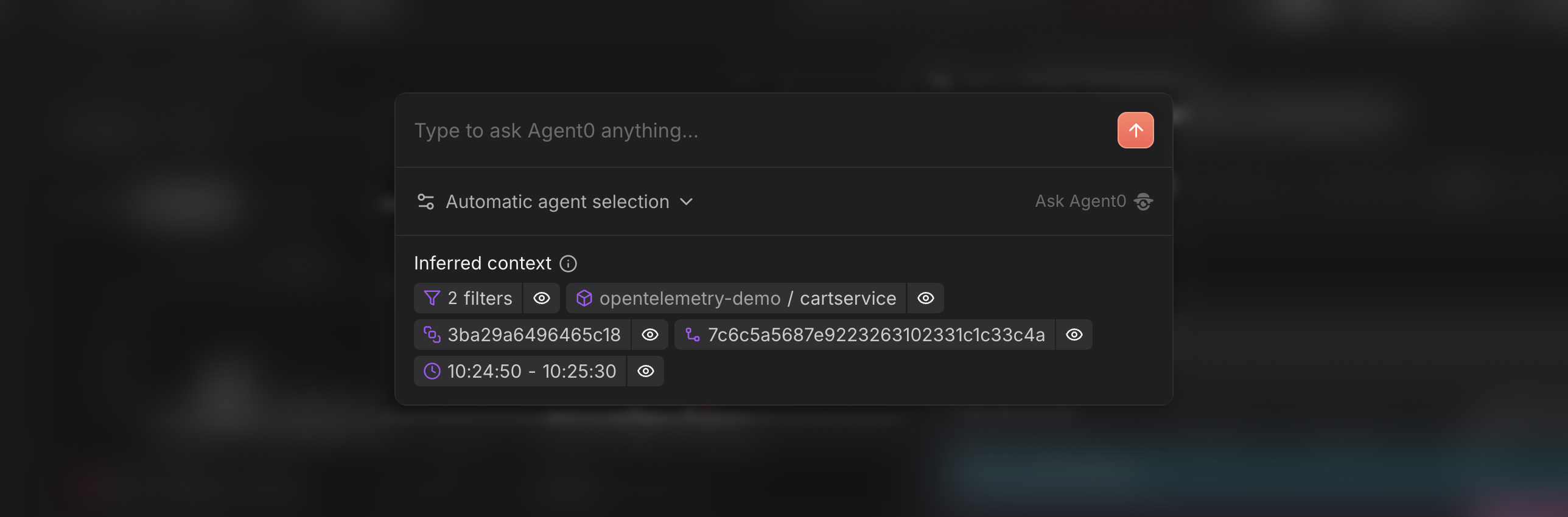 Agent0 Integrated Context automatically infers screen-specific details like filters, trace IDs, services, and time ranges when you open Search with Cmd+Shift+0, enabling hyper-relevant queries without manual input. Control context via eye icons, track origin pages for seamless navigation, and explore 13+ context types for traces, logs, metrics, and more. Reduces troubleshooting friction and accelerates insights directly from your Dash0 views.