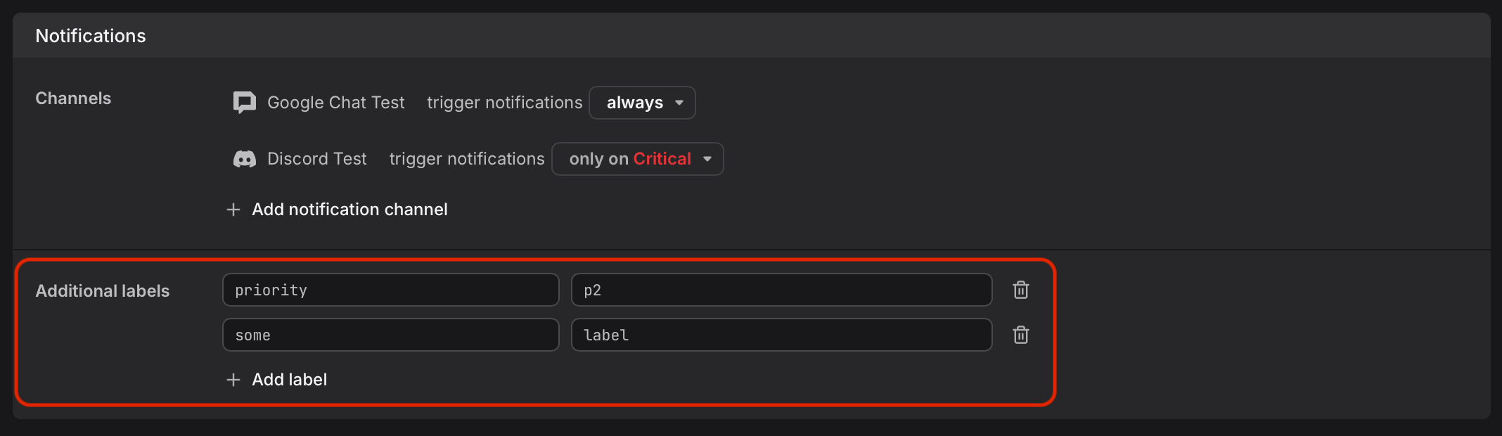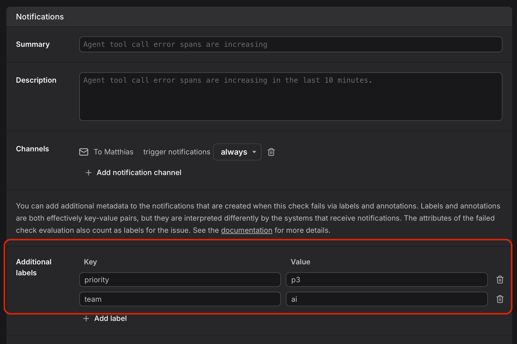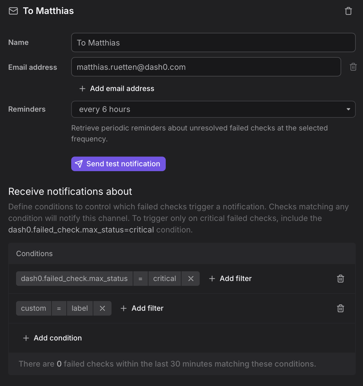 Similar to Prometheus Alertmanager, Dash0 can use labels to determine how alerts are routed to different notification channels. Labels can be attached to check rules and synthetic checks and then referenced in conditions on notification channels.