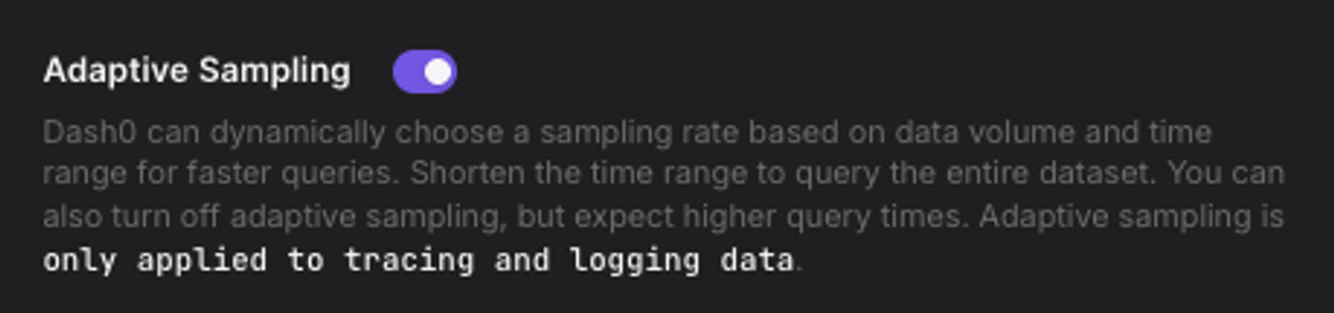 Adaptive Sampling ensures Dash0 queries remain fast when exploring large volumes of logs, traces, and metrics. When you query data in the Dash0 UI, sampling is automatically applied when needed to maintain responsive performance.