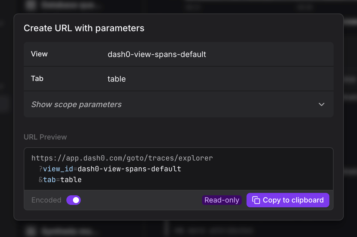 Deeplink URLs provide direct access to specific Dash0 views with pre-configured parameters. Any view can be shared as a URL that automatically applies filters, time ranges, and other settings when opened.
