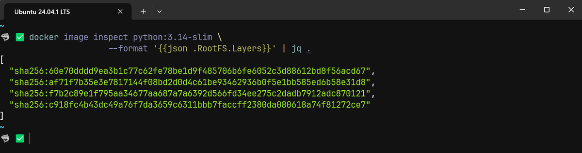 12docker image inspect python:3.14-slim \--format '{{json .RootFS.Layers}}' | jq .