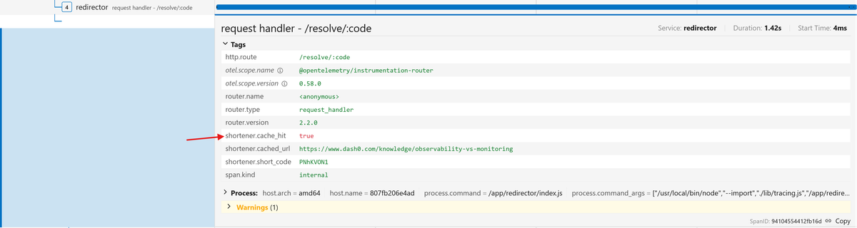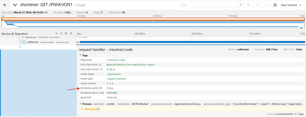 The first visit should show shortener.cache_hit: true in the trace, and the