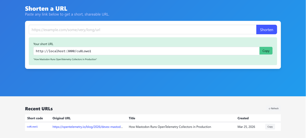 Shortener is the public-facing service that accepts URLs from users, fetches metadata (title and description) from the target page, stores everything in PostgreSQL, caches the mapping in Redis, and serves a web UI. When a user visits a short URL, this service proxies the request to the Redirector.