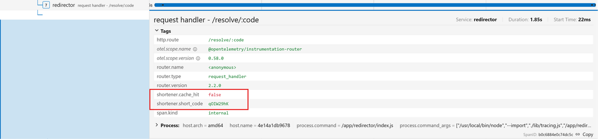 123456789101112131415161718192021222324// redirector/routes.jsimport { trace } from "@opentelemetry/api";// [...]router.get("/resolve/:code", async (req, res) => {const { code } = req.params;try {// Step 1: Check Redis cacheconst cached = await redis.get(`urls:${code}`);const span = trace.getActiveSpan();if (span) {span.setAttribute("shortener.short_code", code);span.setAttribute("shortener.cache_hit", !!cached);}// [...]} catch (err) {console.error("Resolve failed:", err);res.status(500).json({ error: "Internal server error" });}});