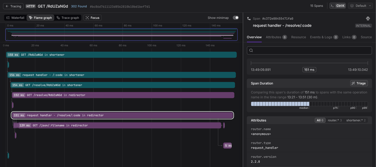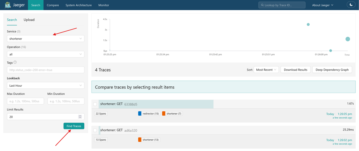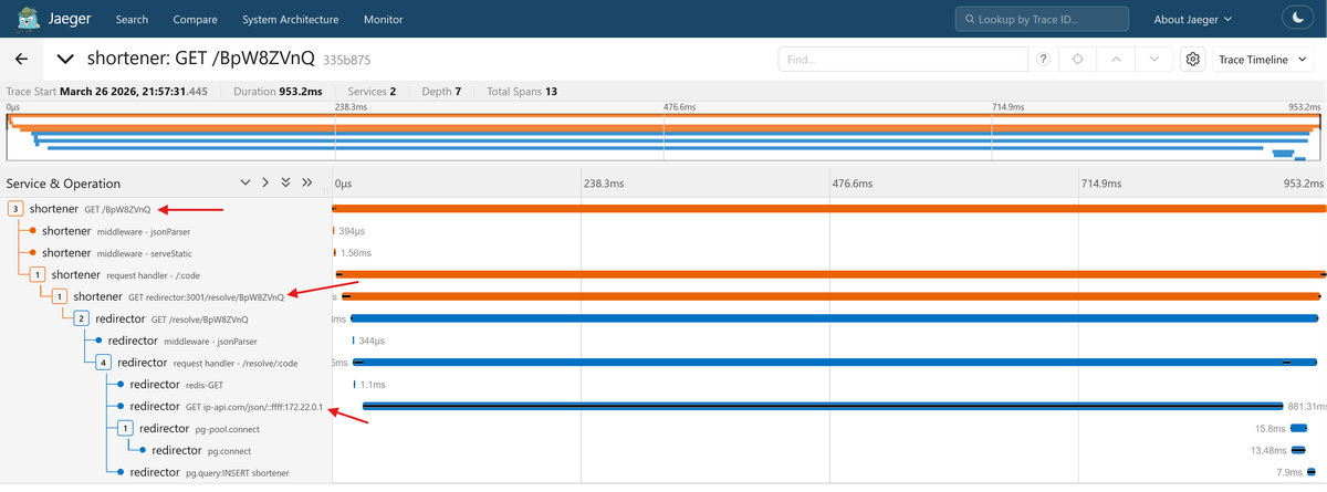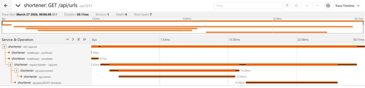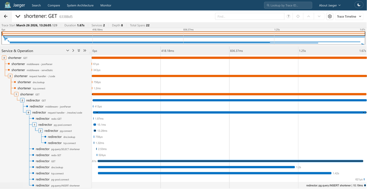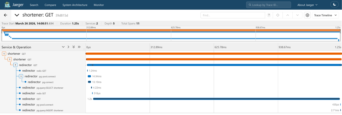 Create a short URL, then follow the redirect. Go to Jaeger and open the trace