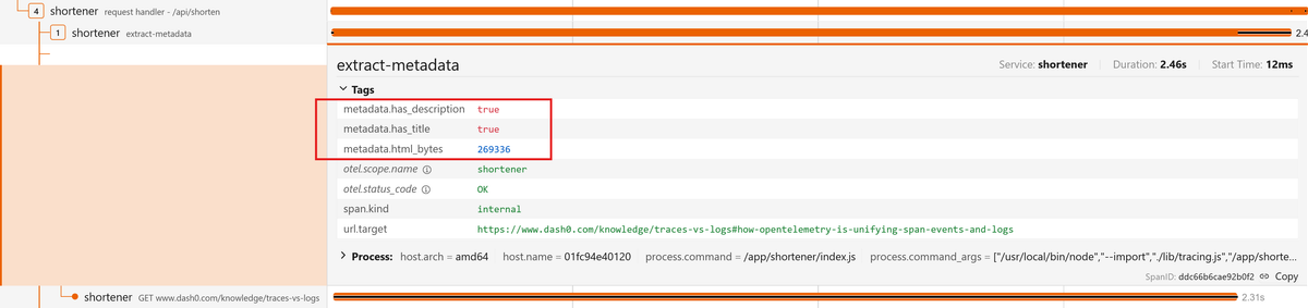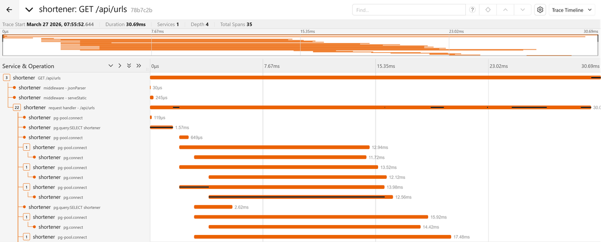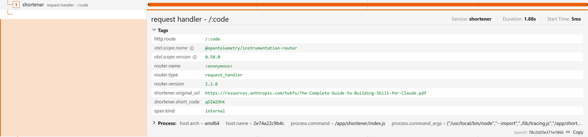 1234567891011121314151617181920212223242526272829303132333435{resource: {attributes: {'service.name': 'shortener','process.pid': 19,'process.executable.name': 'node','process.executable.path': '/usr/local/bin/node','process.command_args': [ '/usr/local/bin/node', '/app/shortener/index.js' ],[...]}},instrumentationScope: {name: '@opentelemetry/instrumentation-http',version: '0.214.0',schemaUrl: undefined},traceId: '64e74aaba02ba88664bef3402dfa75d2',parentSpanContext: undefined,traceState: undefined,name: 'GET',id: 'b6a49f7987aed7f8',kind: 1,timestamp: 1774511881199000,duration: 37289.78,attributes: {'http.url': 'http://localhost:3000/api/urls','http.host': 'localhost:3000','net.host.name': 'localhost','http.method': 'GET',[...]},status: { code: 0 },events: [],links: []}